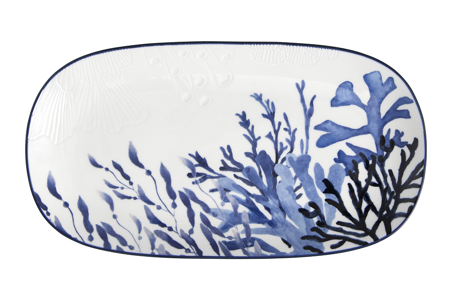 Большие органические формы с выдавленным узором второго плана добавляют роскоши сервировке и создают атмосферу расслабленного отдыха на море.