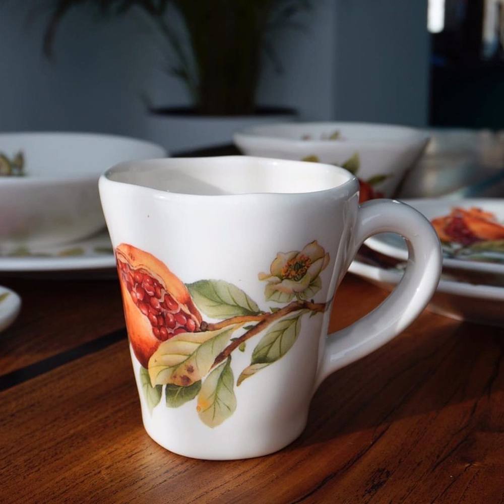 Крупные формы, неровные края, теплый цвет фона, флористический декор цветущей ветки граната с плодами - всё приносит воспоминания о солнечной радостной Италии, где предметы искусства можно встретить не только в музеях, а "на каждом шагу" - в посуде, предметах мебели, одежде, зданиях, кулинарии... Коллекция «Гранат» универсальна, в ней можно найти предметы для сервировки завтрака, для украшения столовой, оформить сервировку праздничного обеда, уединиться с кружкой чая и книжкой и др.Посуда и предметы сервировки ТМ CUORE прочные, безвредны для здоровья, прошли тесты на содержание свинца и кадмия в сырье. Используемая глазурь и пигменты для окрашивания не содержат свинец.