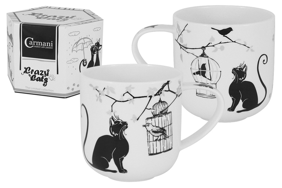 Кружка 500мл CRAZY CATS. Кошка и птичка, фарфор костяной