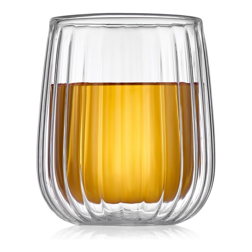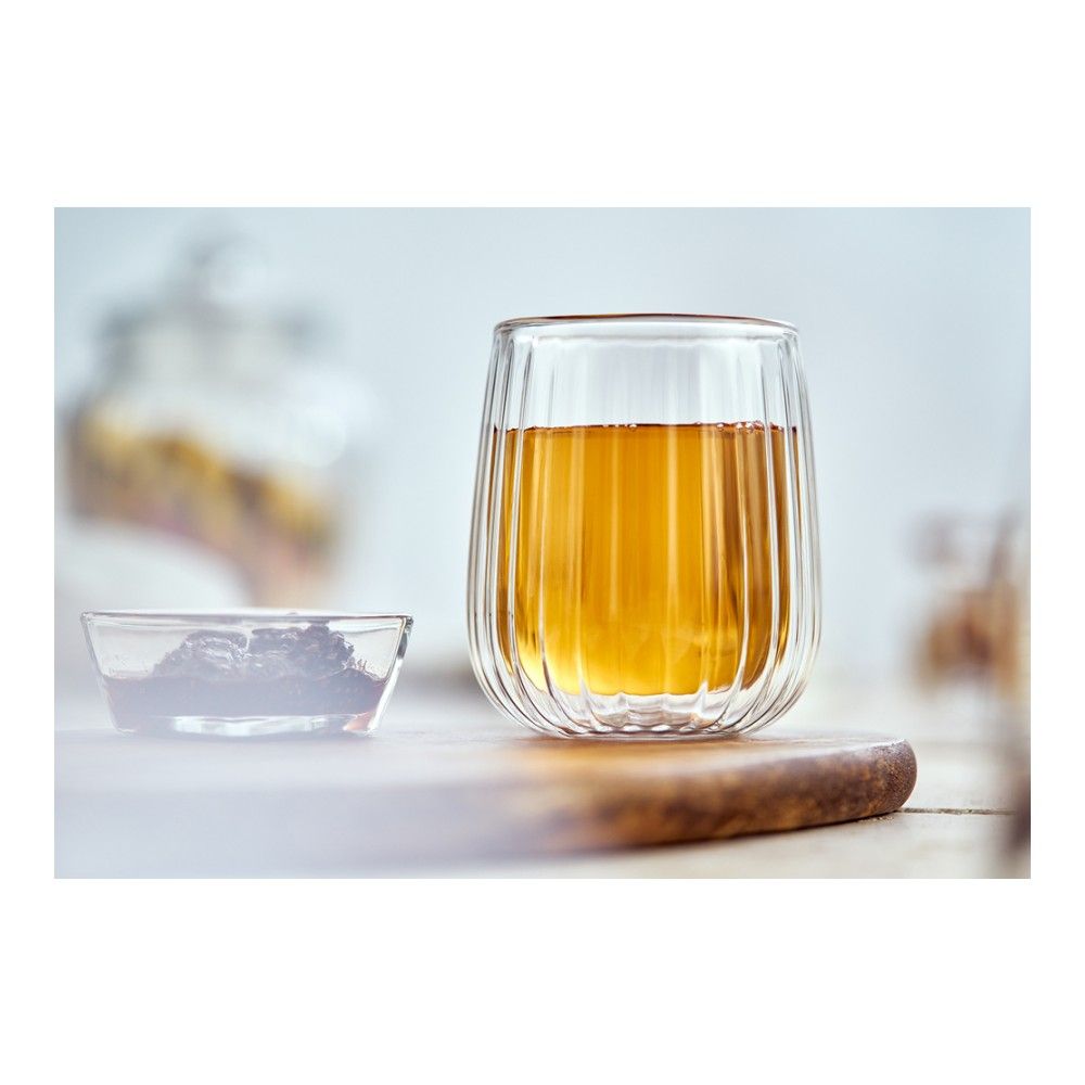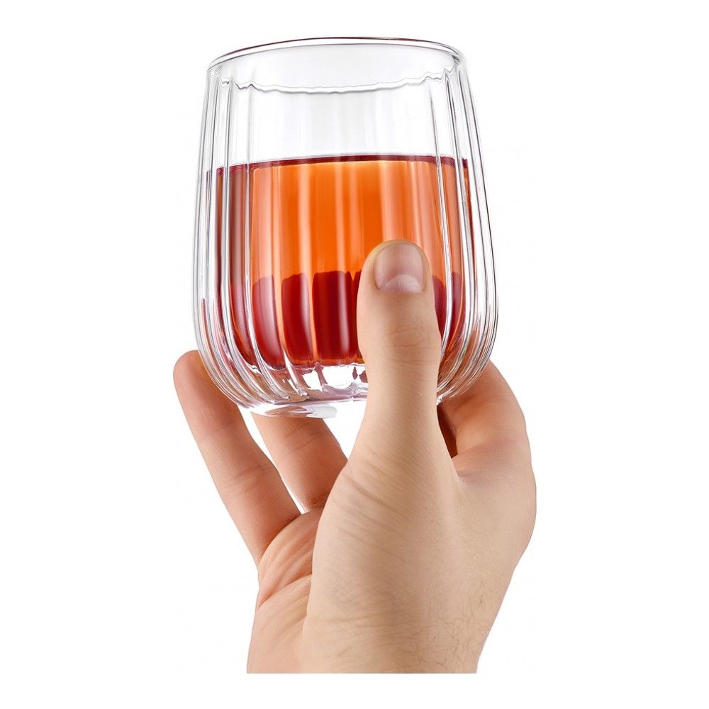 Прослойка воздуха между стенками сохраняет температуру напитков дольше обычного. Внешняя стенка бокала при этом остается холодной, даже если внутри кипяток. Так что вы можете держать посуду с горячим чаем или кофе голыми руками, не опасаясь обжечься.
