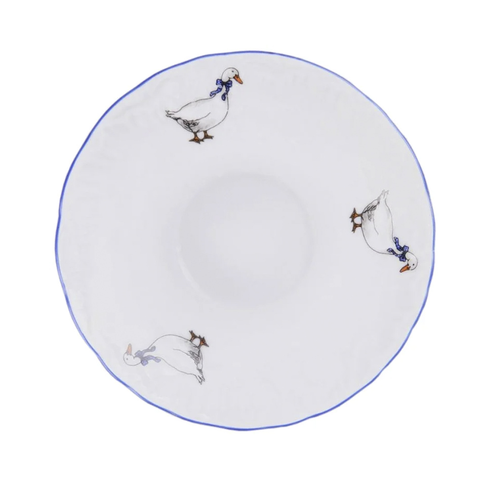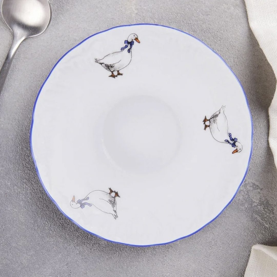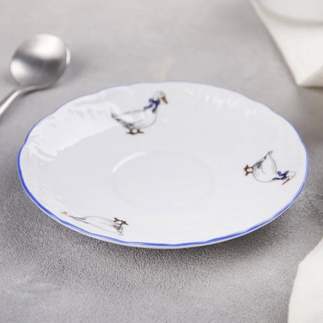 Посуда из фарфора с изображениями гусей очень популярна. Гуси, нарисованные на фарфоровой посуде, всегда имеют синие банты в горошек. Сам рисунок выполнен в характерной технике на кипельно белом фоне. Считается, что рисунок был создан еще в XVIII -м веке — изображения гусей встречаются на антикварном фарфоре, датированном этим периодом.