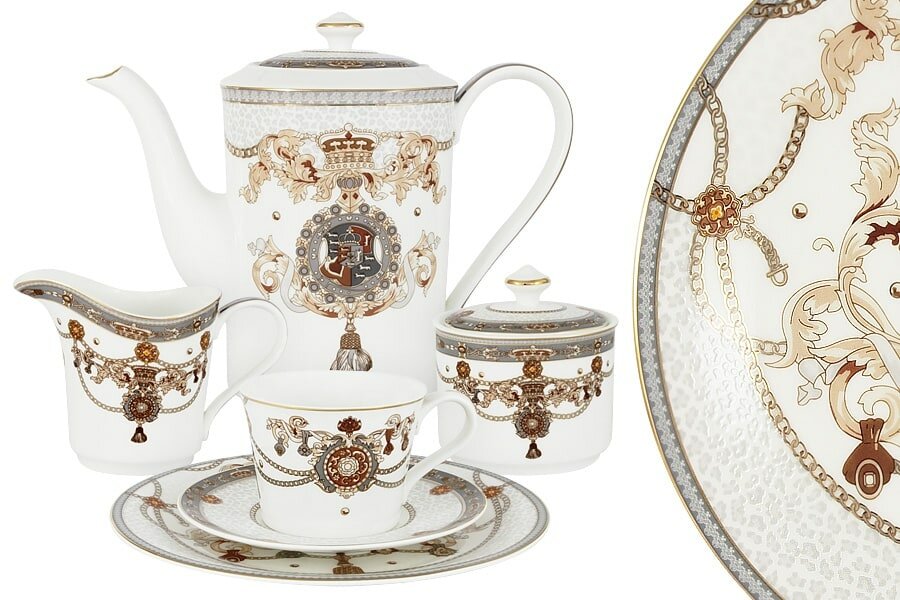 Коллекция «Принц Эдвард» - это парадный сервиз из костяного фарфора для особых и официальных случаев. Коллекцию оценят даже те, кого трудно удивить: многофактурность покрытия, оригинальный геральдический рисунок, серо-коричневая цветовая гамма с золотой окантовкой и строгие современные формы. Сложный рисунок украшает предметы этой коллекции. Каждый элемент имеет свое значение. Короны, рыцарский шлем, щит, золотые цепи, акантовые листья, арфа, леопарды - все эти королевские символы можно найти на гербе Великобритании.