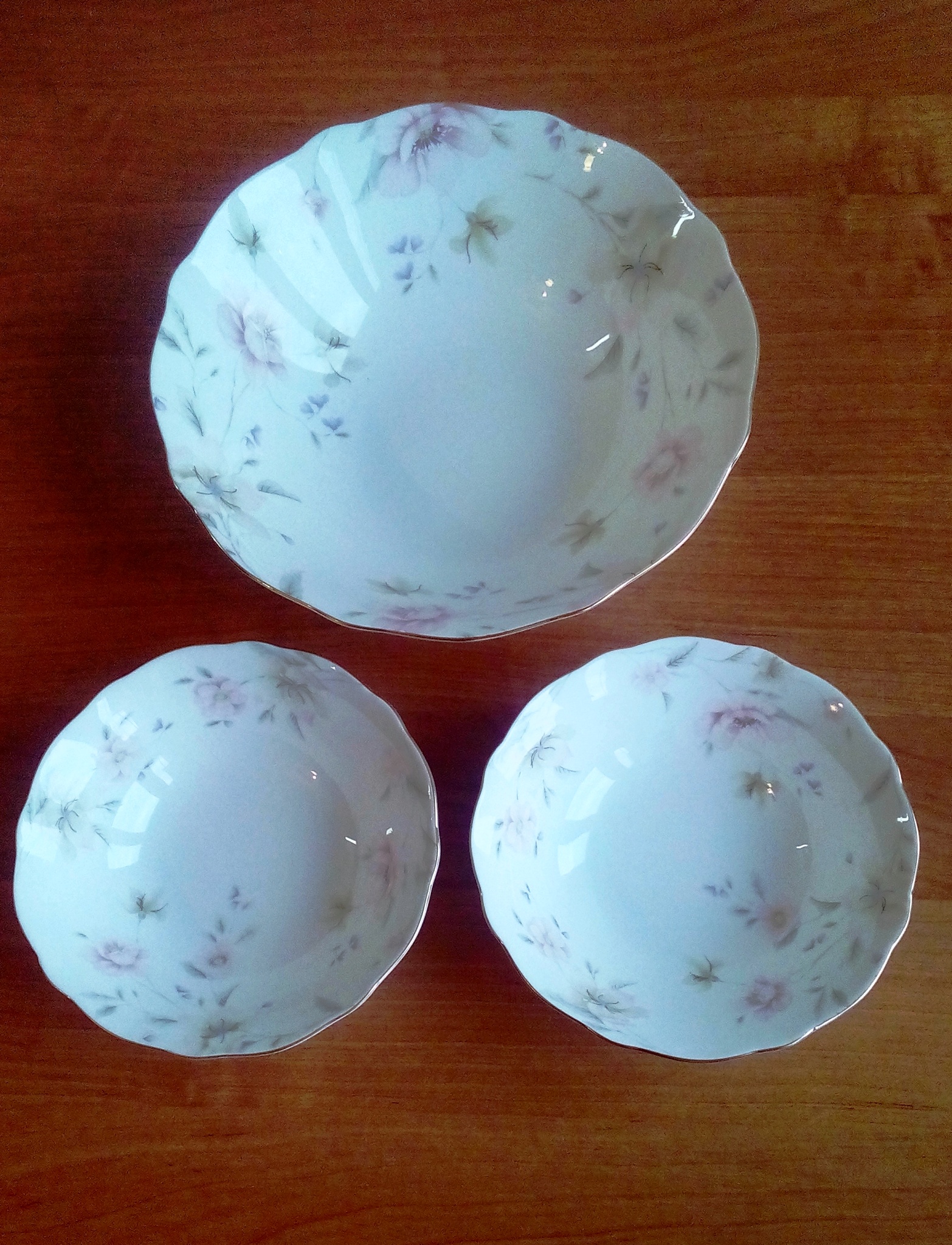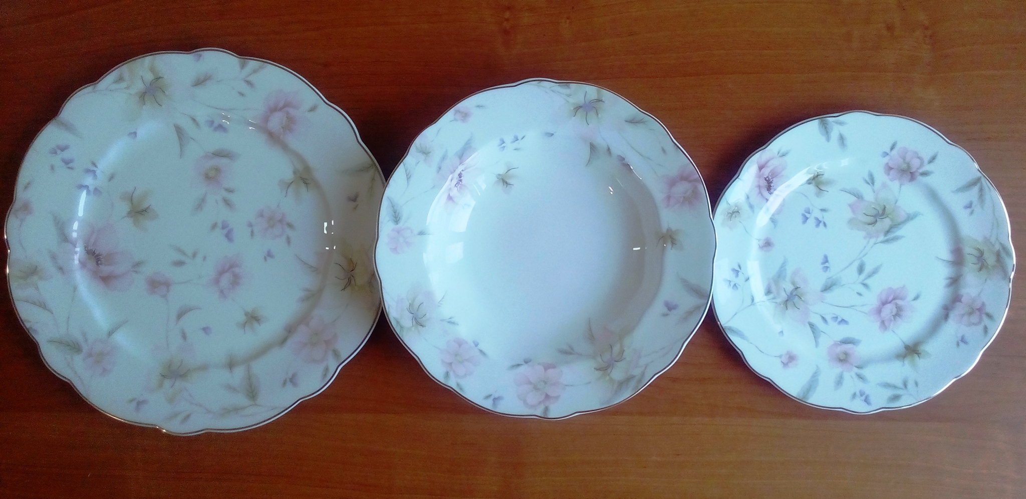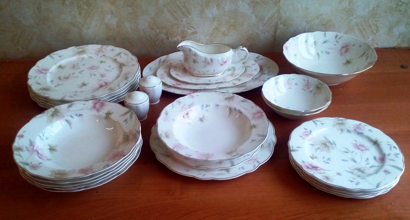 Комплектация: : 6 обед.тарелок 27см, 6 суп.тарелок 21.5см, 6 закус.тарелок 21см, 1 салатник 23см, 2 салатника 14см, 1 блюдо 36см, 1 блюдо 23см, соусник+блюдо под него, солонка, перечница