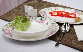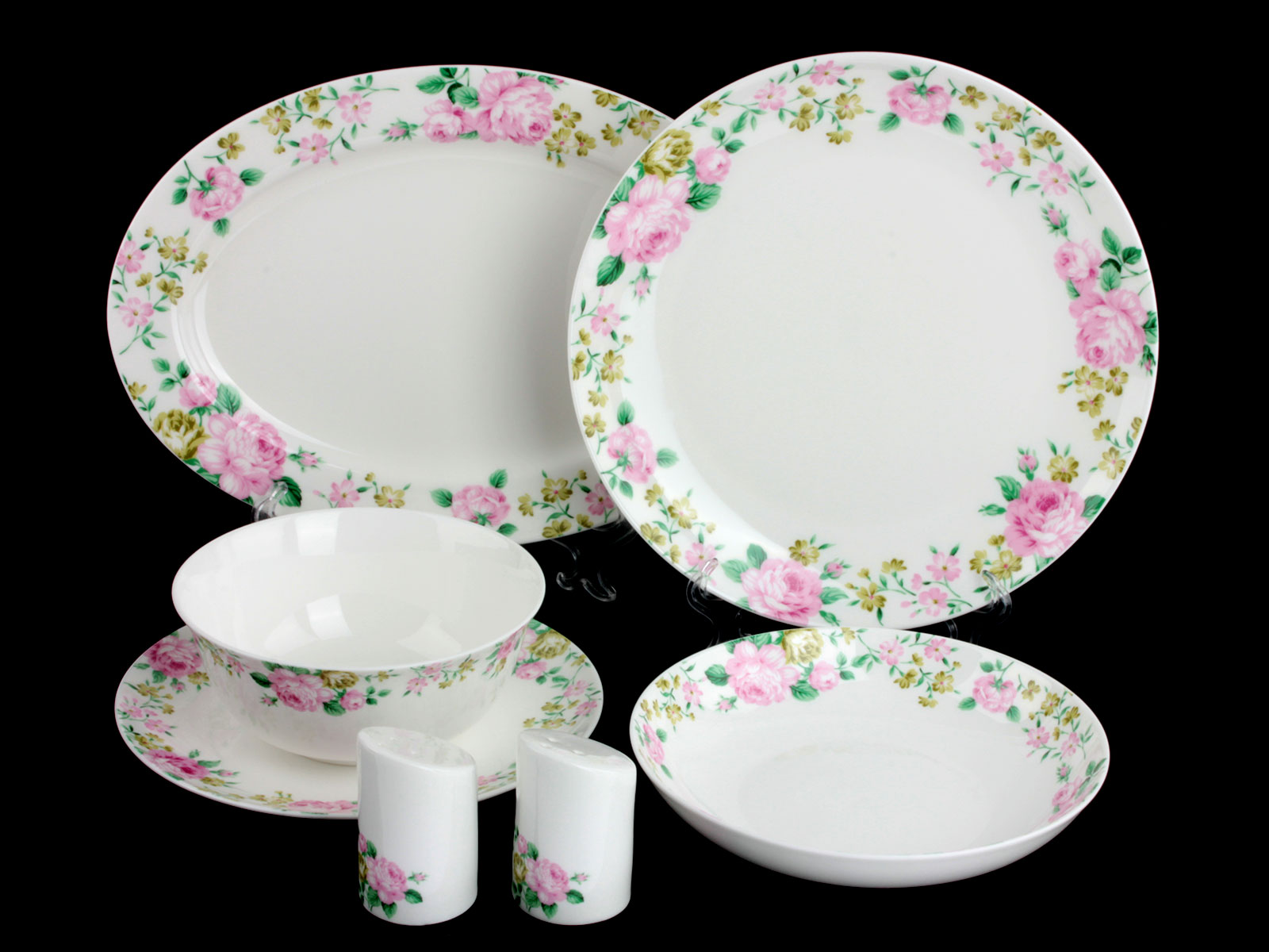 Комплектация: тарелка десертная 20см-6шт, тарелка 25см-6шт, тарелка глубокая 19,5см-6шт, салатник 15см-6шт, блюдо овальное 31х22см, солонка, перечница.