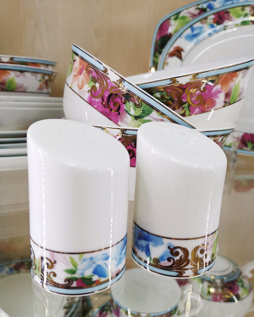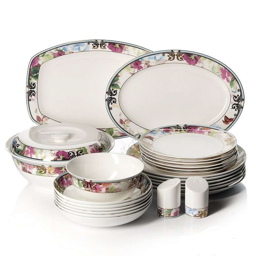 Комплектация: тарелка 25,5см-6шт, тарелка глубокая 19,5см-6шт, тарелка десертная 20см-6шт, салтник 15см-6шт, супница 1,65л, блюдо прямоугольное 33,5х23см, блюдо овальное 31х22см, перечница, солонка .