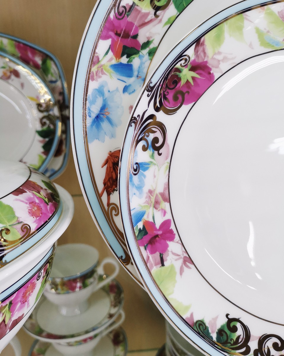 Великолепная посуда из коллекции Цветущий сад торговой марки Royal Aurel создает радостную летнюю атмосферу за сервированным столом. Изготовленная из костяного фарфора посуда украшена широкой каймой живописных цветов. По обе стороны кайма окантована тонкими золотыми линиями. Особого изящества посуде придают витиеватые золотые узоры на самой кайме. Хрупкая на вид посуда хорошо выдерживает мытье в посудомоечной машине (но только на деликатном режиме, без абразивных средств и при низкой температуре), поэтому она подходит не только для оформления праздничного стола, но и для сервировки обеда или ужина в семейном кругу.