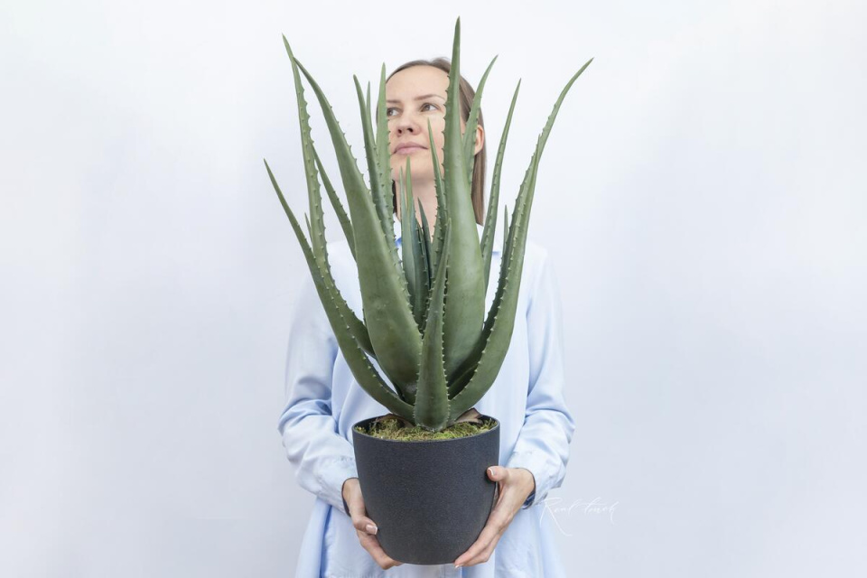 Алоэ из плотного силикона равномерного зелёного цвета в чёрном техническом кашпо, декорированное мхом и сухими листочками у основания.