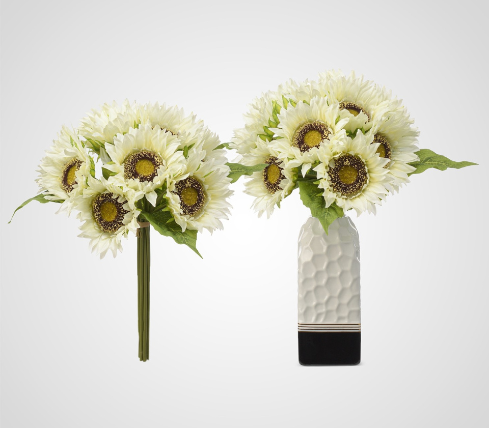 Декоративный букет белых подсолнухов создаст особенную атмосферу в вашем доме. Интерьер станет ярким и неповторимым. Изготовлен из полимерного материала. В букете 10 цветов по 35см.