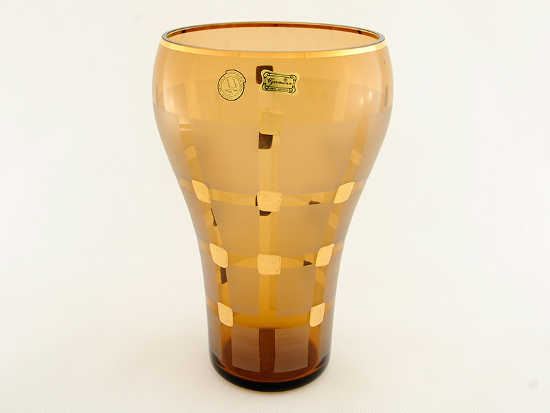 Ваза для цветов высотой 25 см изготовлена в Чехии из цветного стекла. Ваза украшена золотым узорами. Цвет вазы оранжево-жёлтый (с квадратным орнаментом). Можно сказать, ваза имеет "медовый цвет".