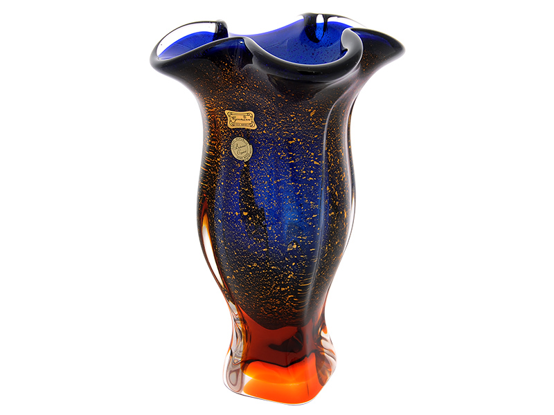Великолепная чешская ваза "Фэнтези Закат золотой" высотой 29см изготовлена из цветного гутинского стекла. Необыкновенная, притягивающая взгляд формой и сочетанием сочных цветов. Глубокий насыщенный синий и медовый амбер, изумительные золотые капли, плавные изгибы линий, сочетаясь, создают неповторимый и стильный предмет для декора интерьера.