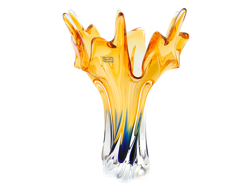 Ваза для цветов Фэнтези сине-жёлтая высотой 32 см. Форма вазы напоминает языки огня. Цвет вазы меняется по всей высоте - от прозрачного на ножке к синему у основания и к жёлтому сверху. Ваза выполнена из классического толстостенного гутинского стекла.