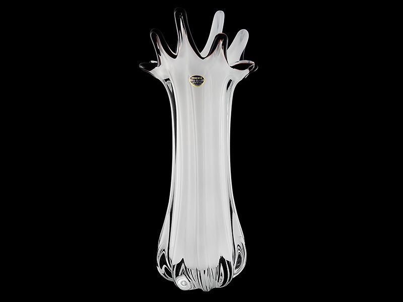 Ваза для цветов "Рива" молочно белого цвета с черным ободком. Ваза выполнена из толстого и тяжёлого чешского стекла с плоским основанием и рельефными, выступающими гранями.