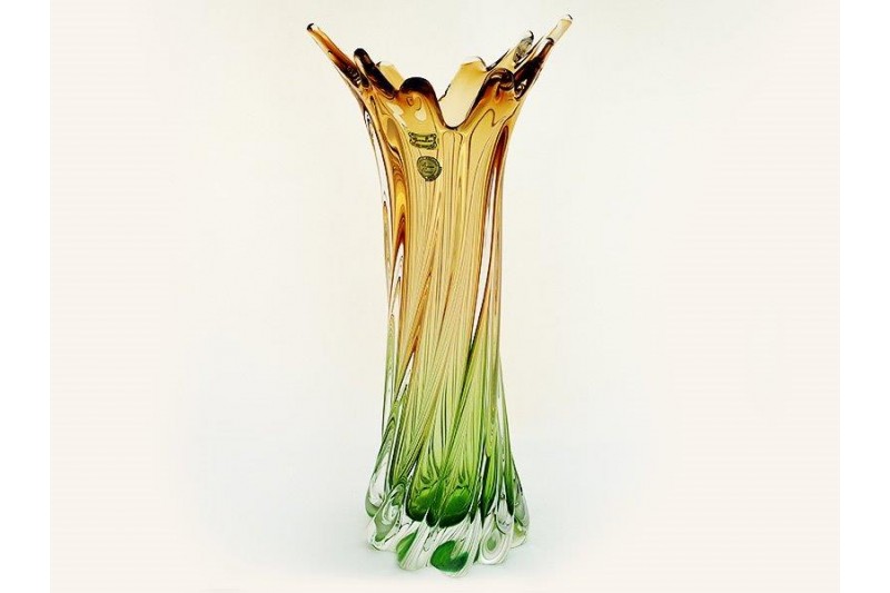 Высокая узкая ваза для цветов Фэнтези бежево-зелёная высотой 40 см. Оригинальная форма вазы как водоворот завершается всплеском воды на горлышке. Цвет вазы переходит от прозрачного и нежно-зеленого у основания к бежевому. Ваза выполнена из классического толстостенного гутинского стекла.