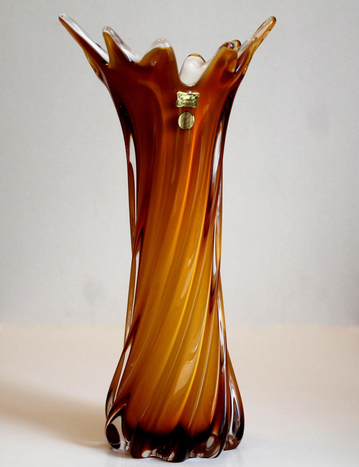 Ваза для цветов "Фэнтези амбер опал" очень приятного медово-жёлтого цвета снаружи и молочно-белого цвета внутри. Ваза выполнена из трёхцветного гутинского стекла. Внешний слой вазы выполнен из прозрачного стекла. В вазе присутствует очень аппетитное и мягкое сочетание цветов. Сочетание формы и цвета навевают мысль о брызгах мёда в чаше с молоком.