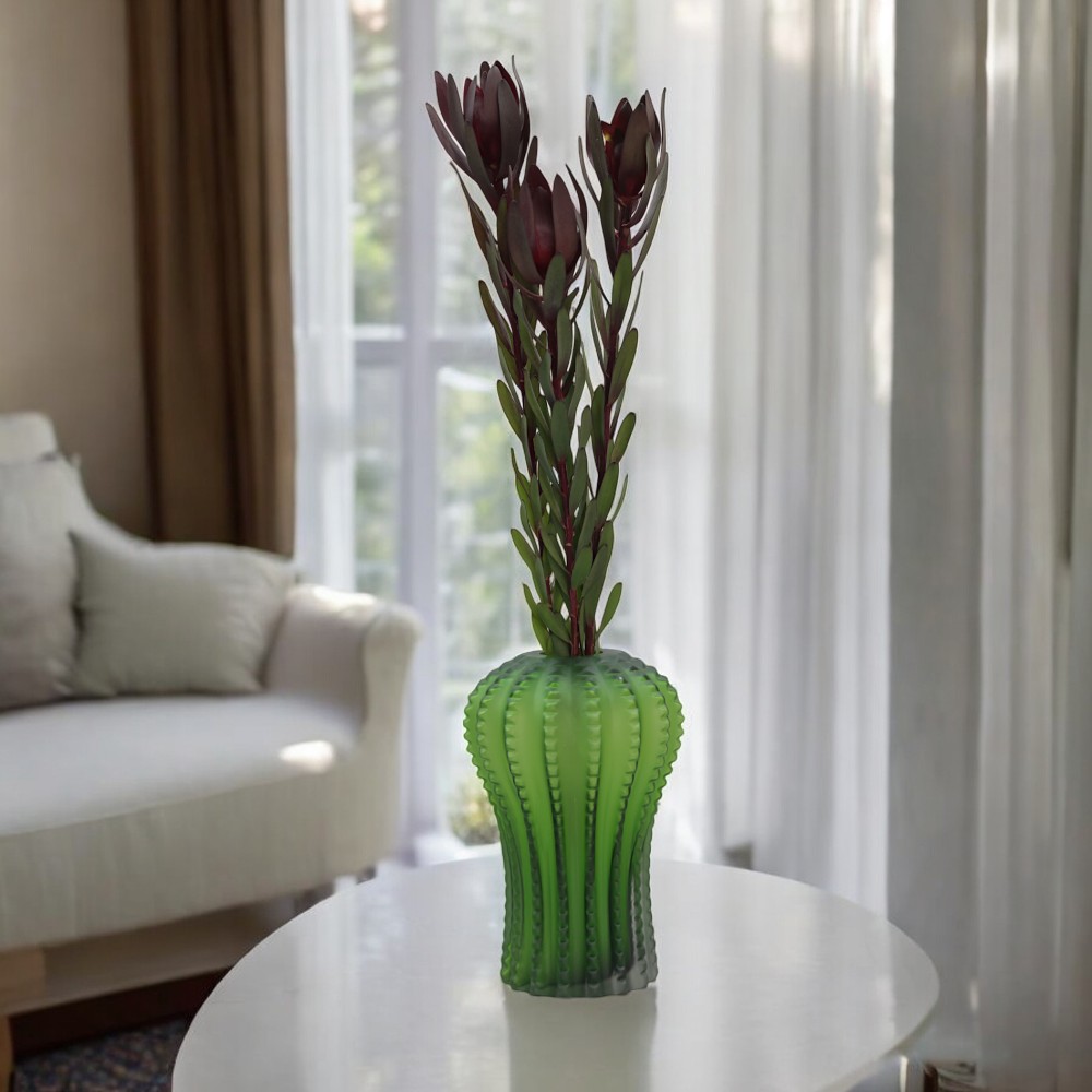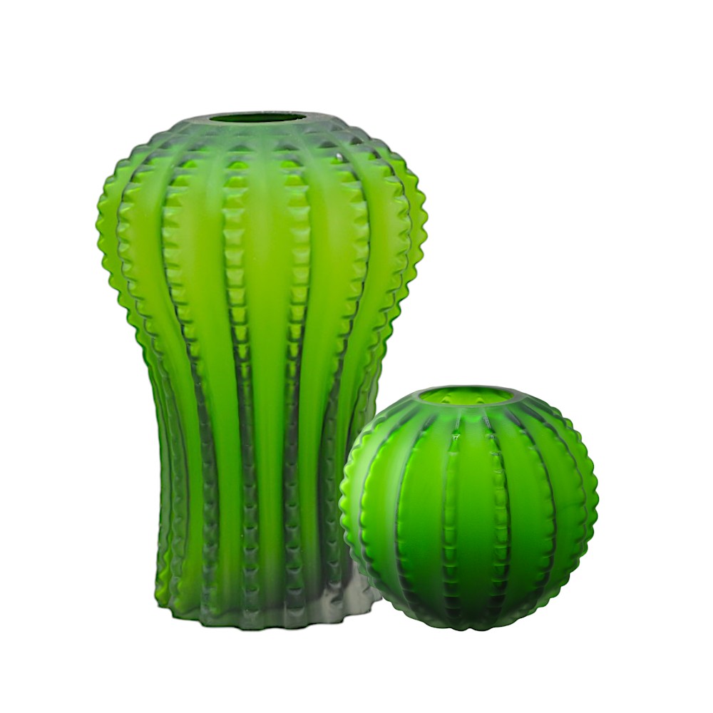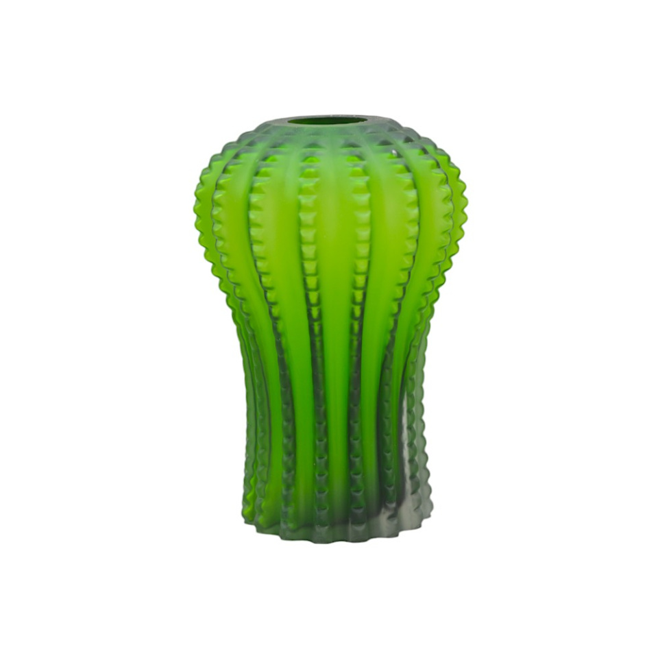 Ваза своим дизайном, выполненным в ярко-зеленом цветном стекле, напоминает кактус. Её можно использовать для хранения симпатичного цветочного букета или в качестве украшения интерьера