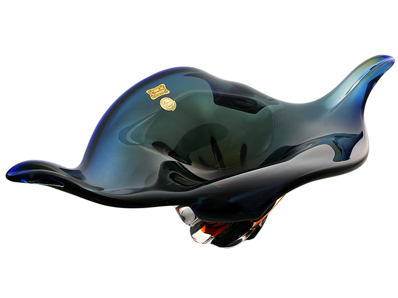 Чешский салатник "Фэнтези Закат" длиной 43 см изготовлен из цветного гутинского стекла. Необыкновенный, притягивающий взгляд формой и сочными цветами. Глубокий насыщенный синий и медовый амбер, в сочетании с плавными изгибы линий, создают неповторимый и стильный предмет для декора интерьера.
