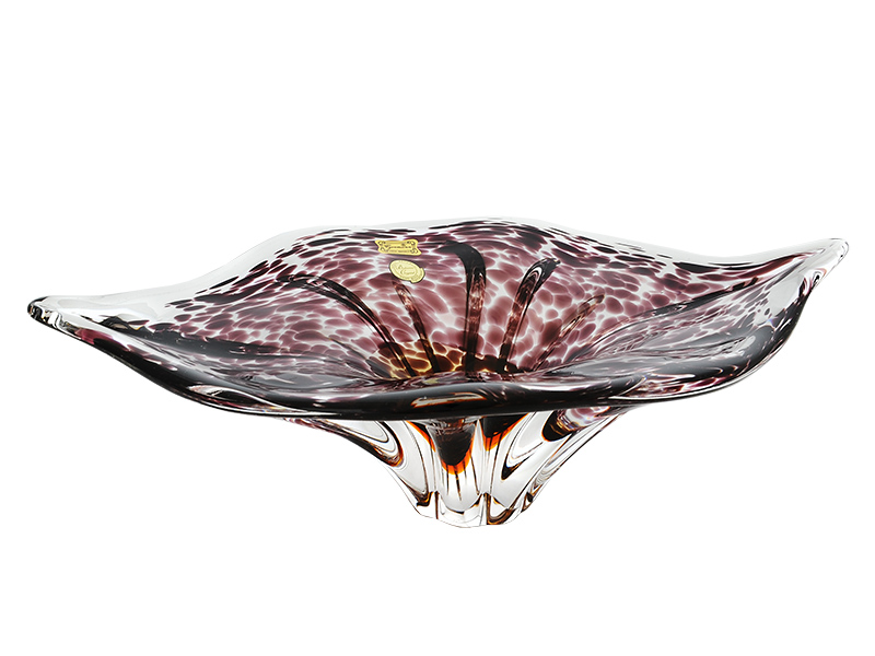 Ваза для фруктов - Фэнтези "Тигровая" фиолетовая подходит для фруктов или конфет. Ваза на невысокой ножке выполнена из цветного стекла с пёстрой расцветкой в фиолетовых и коричневых цветах. Ножка и края фруктовницы прозрачные.