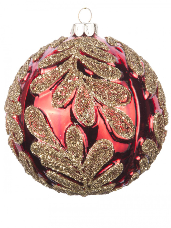 Шар 10см красный с золотыми листьями, стекло