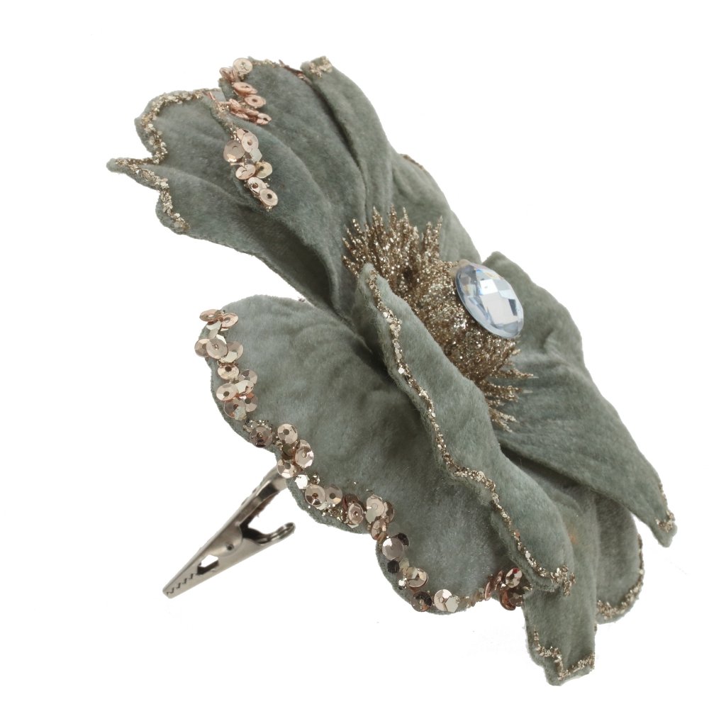 Объемный цветок с бархатными лепестками , с декором из блесток и красивой сердцевинкой. Прекрасное украшение для новогодней елки и флористических композиций.